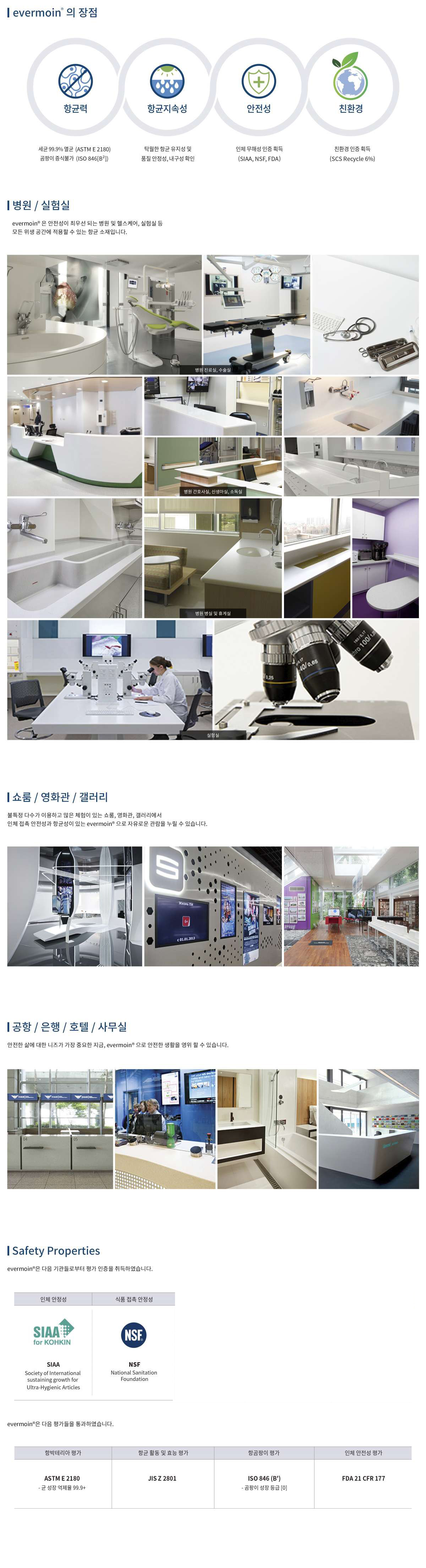 Evermoin®은 일상생활 곳곳에서 인체와 환경에 해가 없는 안전한 소재이며, 기능의 변함없이 지속적인 사용이 가능한 소재입니다. 특히, 의료시설 및 불특정 다수가 이용하는 공간을 위생적으로 관리, 운영할 수 있는 항균 소재입니다.