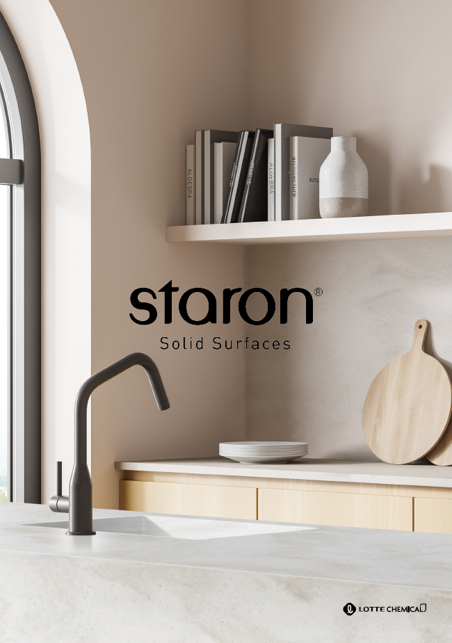 В маркетинговых и PR материалах рассказывается об отличном качестве минерального материала Staron и приведены примеры его использования.